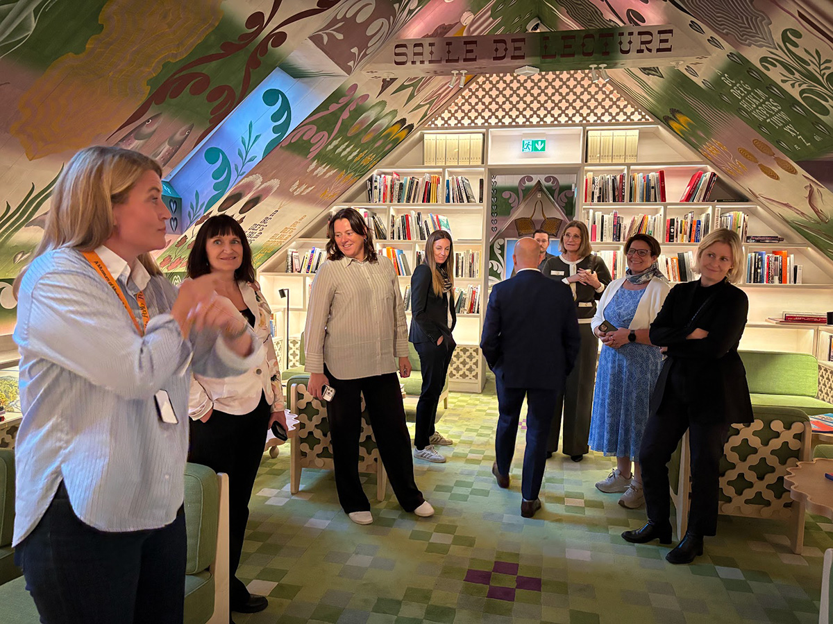 Avslutningsvis fikk deltakerne en unik innsikt i transformasjonen av Kulturkvartalet. Hvordan kan man renovere et helt kvartal i høyeste verneklasse og samtidig skape et levende kulturbygg? Sven-Erik Nordbotten fra EC Dahls Eiendom og PoMo-direktør Marit Album Kvernmo fortalte om realiseringen av Kulturkvartalet – fra Reitan-familiens idé, gjennom en 11 måneders reguleringsplan, til tett samspill mellom interiørarkitekt India Mahdavi, entreprenør, byggherre og kunstfaglige aktører – som har resultert i et vakkert og funksjonelt bygg.